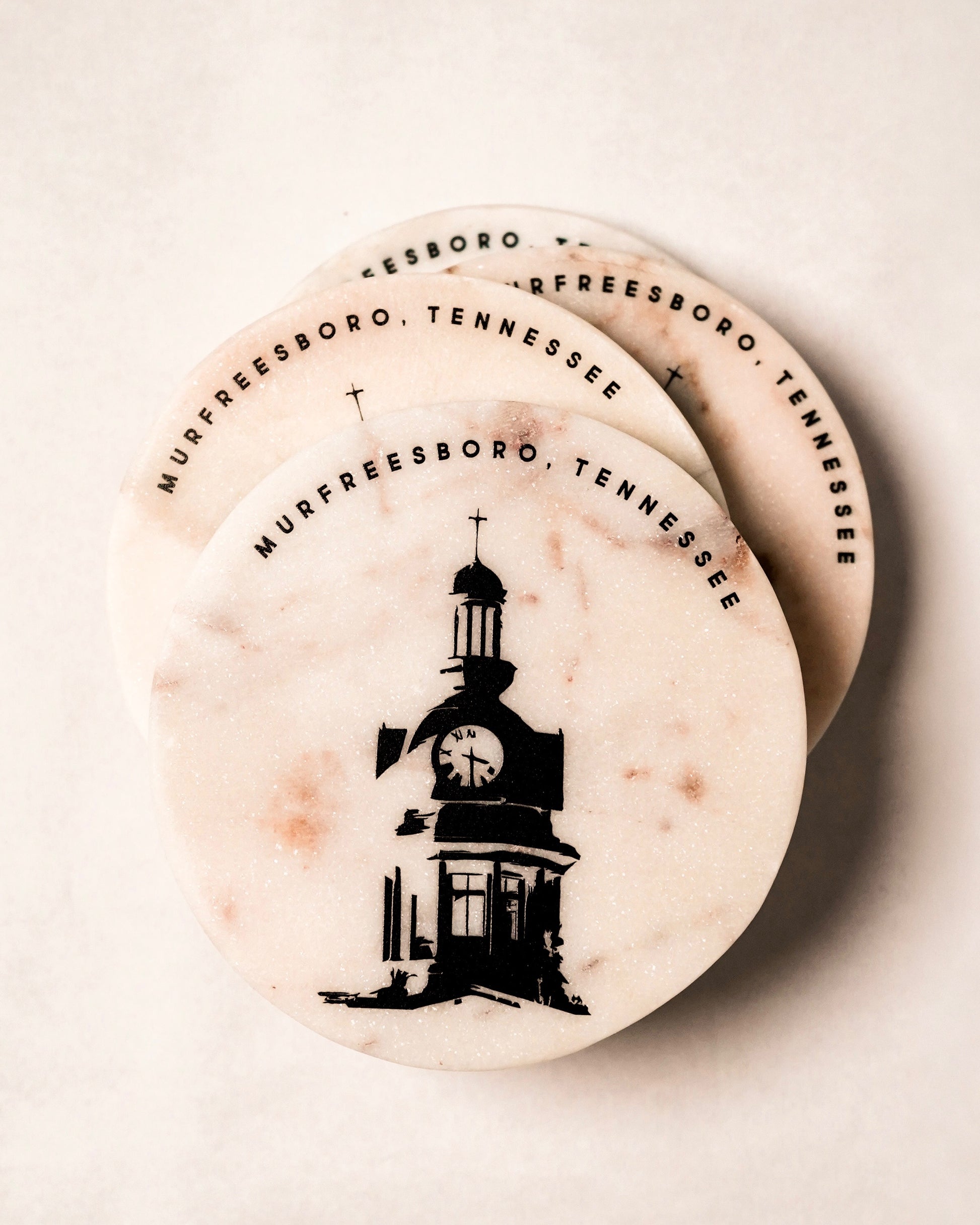 Protect your furniture from those yucky drink rings with our locally made marble coasters! These natural stones have unique coloring that make each one different! Display your love for your city of Murfreesboro with these beautiful table top coasters!