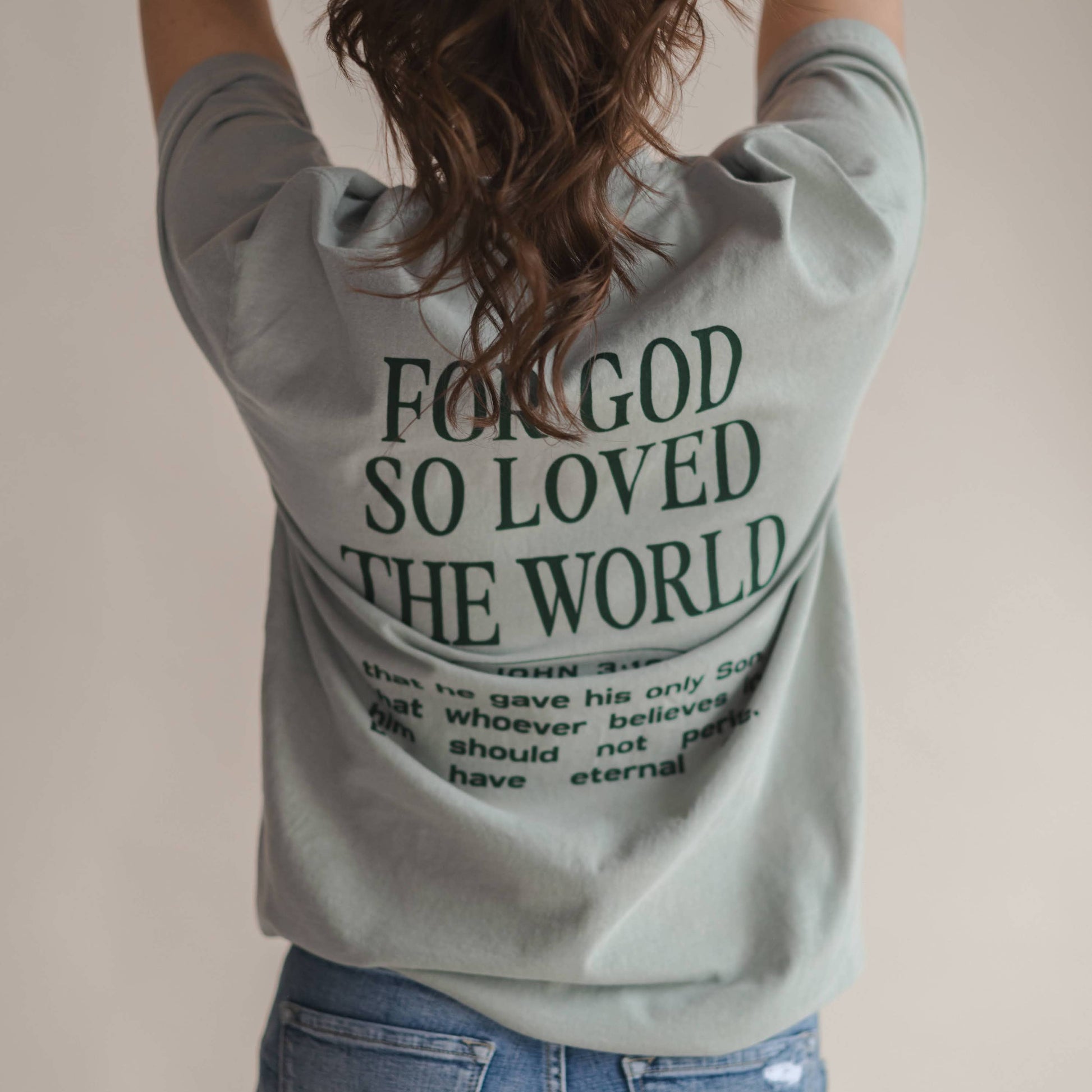 Rooted in John 3:16, this tee shares the heart of the gospel in a way that feels approachable, modern, and easy to wear. Printed in dark green ink on a soft bay-colored Comfort Colors tee, it offers a relaxed unisex fit with that perfectly worn-in feel you’ll reach for again and again.