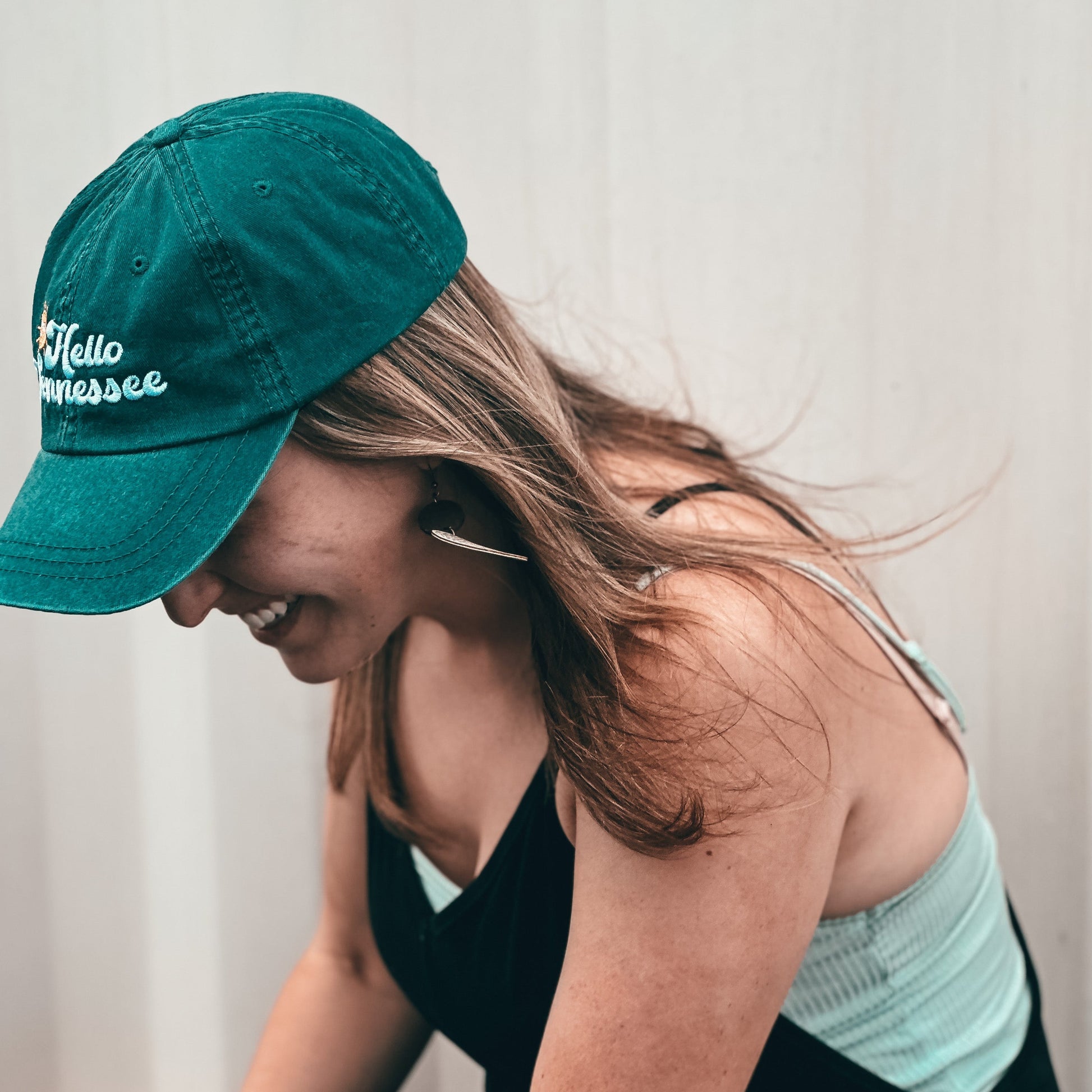 Hat hair don’t care, and rocking it with style! Perfect summer heat relief with our retro Hello Tennessee ballcap!