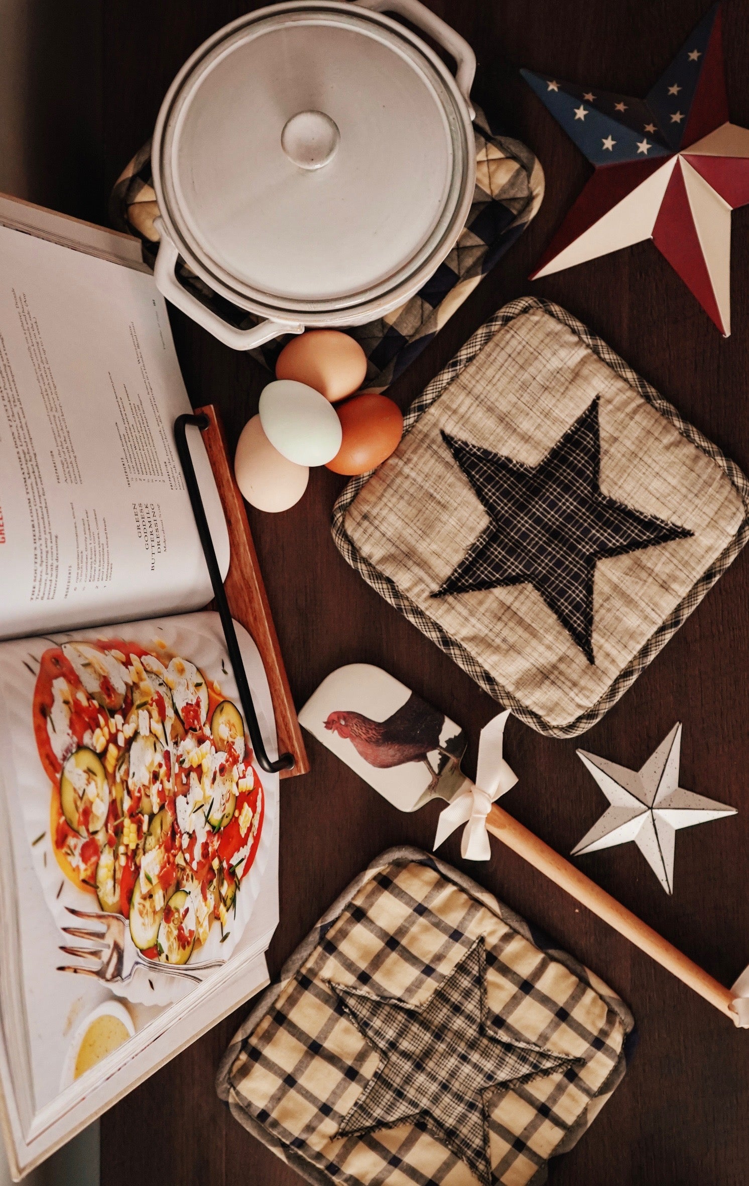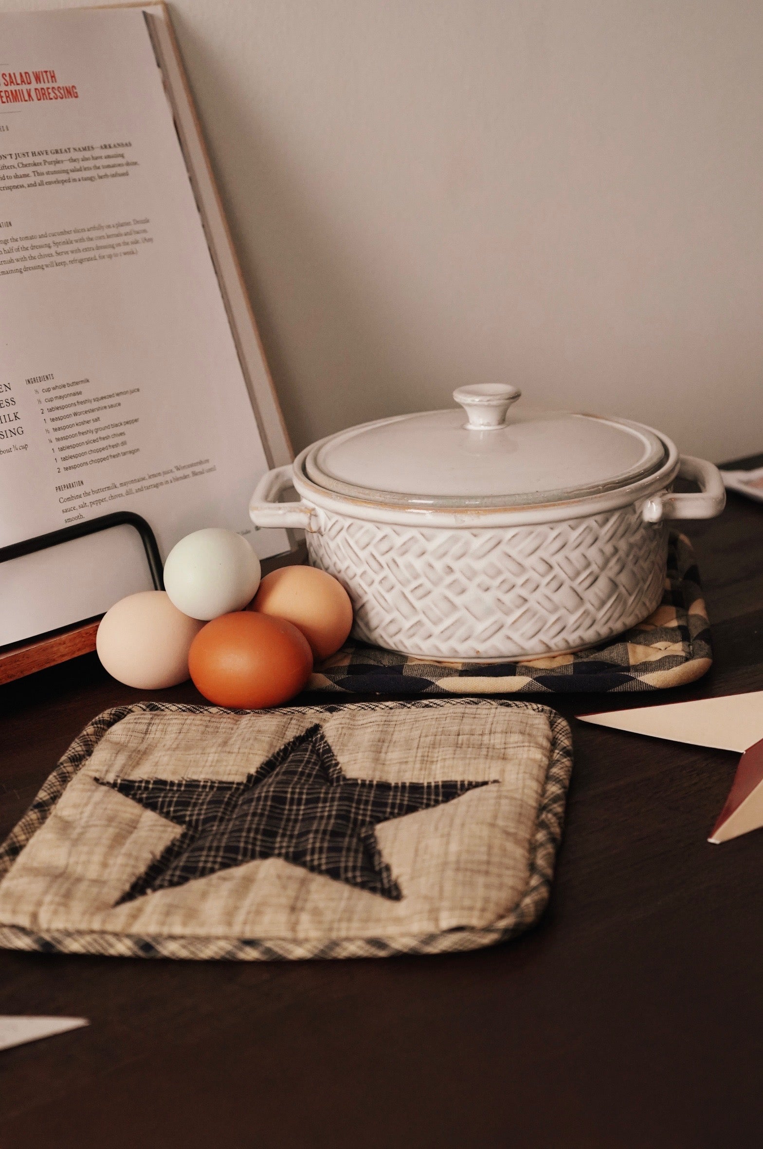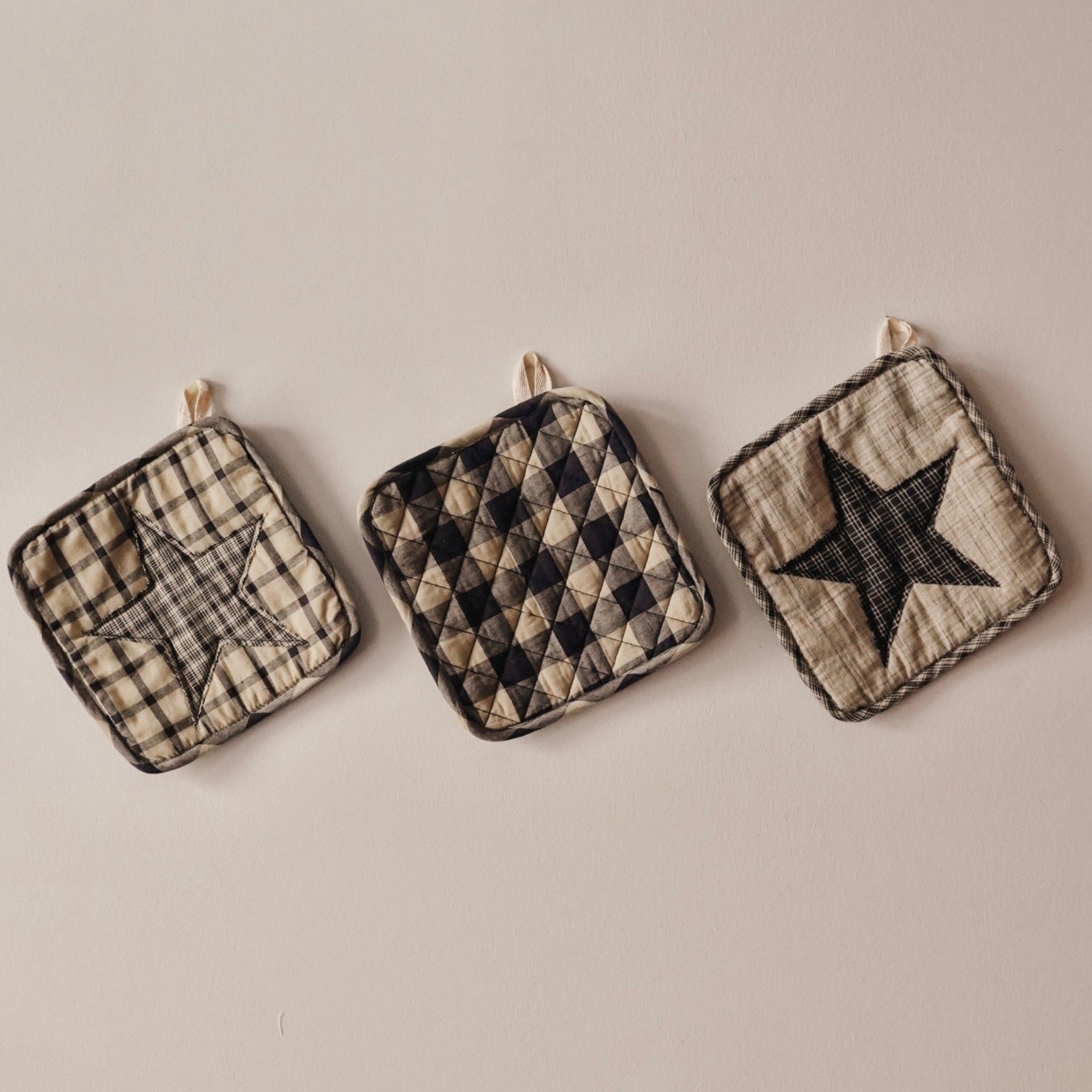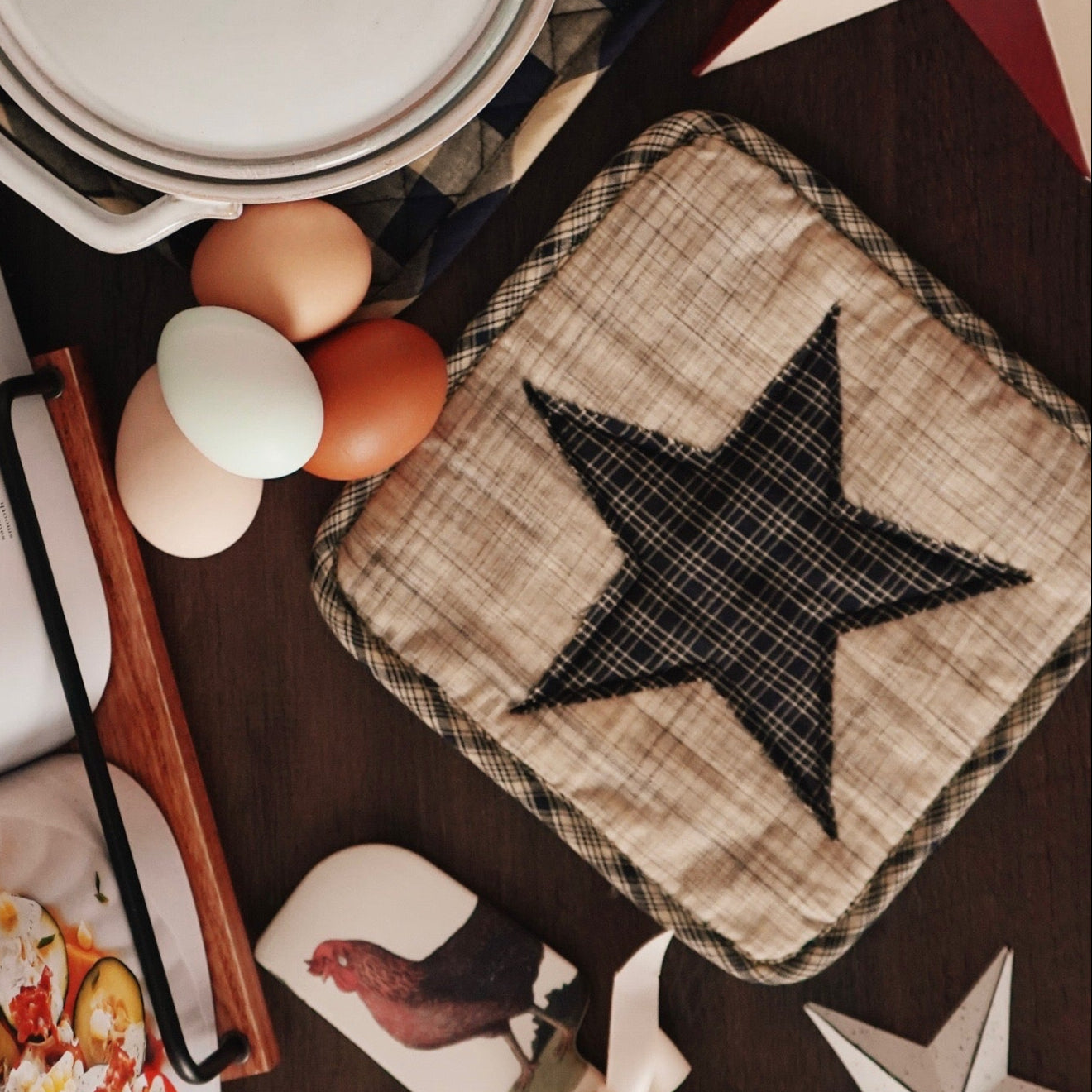 A charming addition to your kitchen decor with a touch of Americana and country style. These square 8x8-inch pot holders not only offer heat resistance but also feature an eye-catching design, perfectly capturing the essence of a country home. Crafted in a flat weave, these pot holders combine both form and function, making them a fantastic addition to your kitchen. Embrace the spirit of Americana!