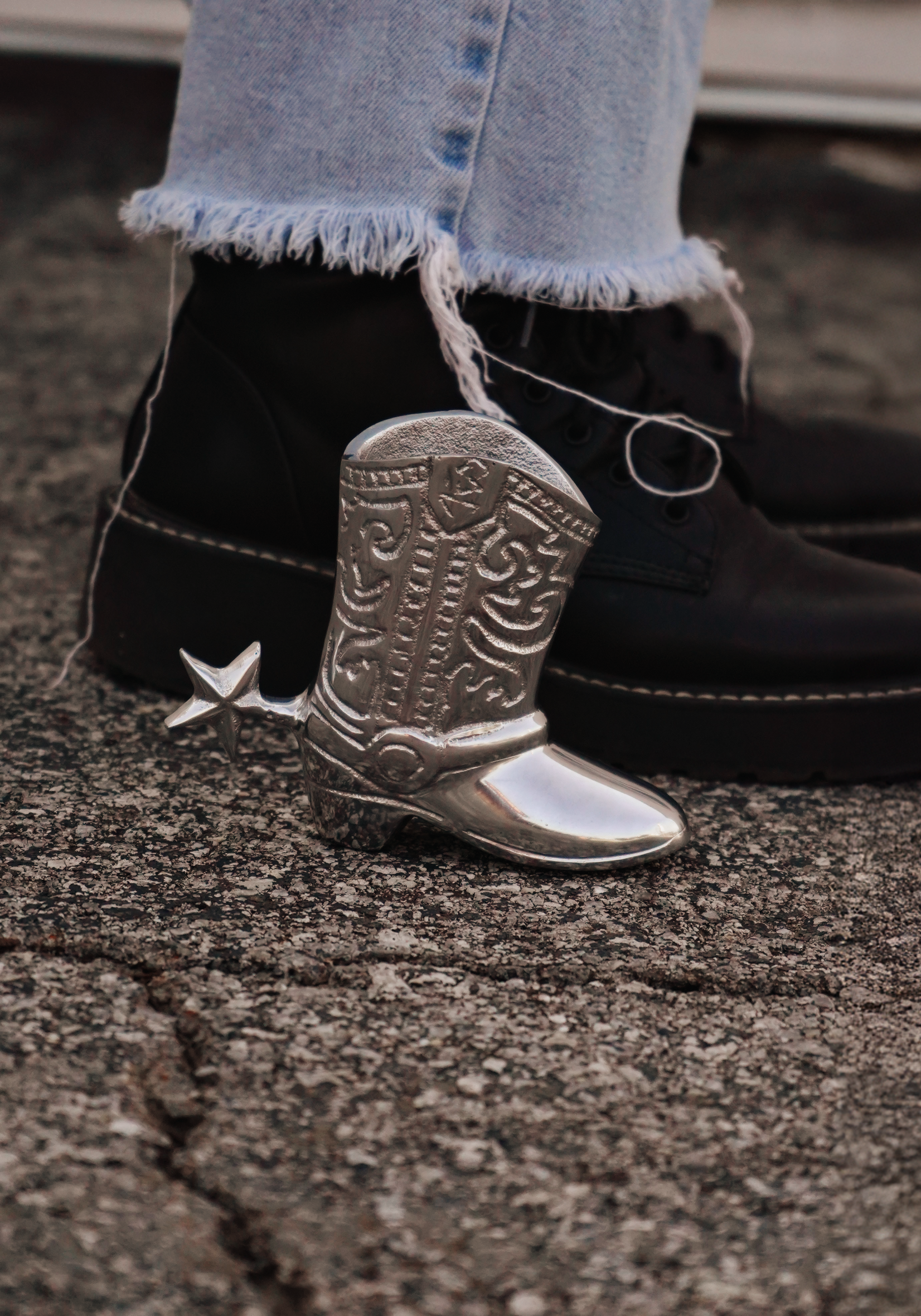 This little boot was made for decorating — and that’s just what it’ll do. Perfect as a vase for flowers, a holder for dried wheat, or just a cute accent on your mantle or table, this handmade silver boot brings a touch of rustic charm to any room.