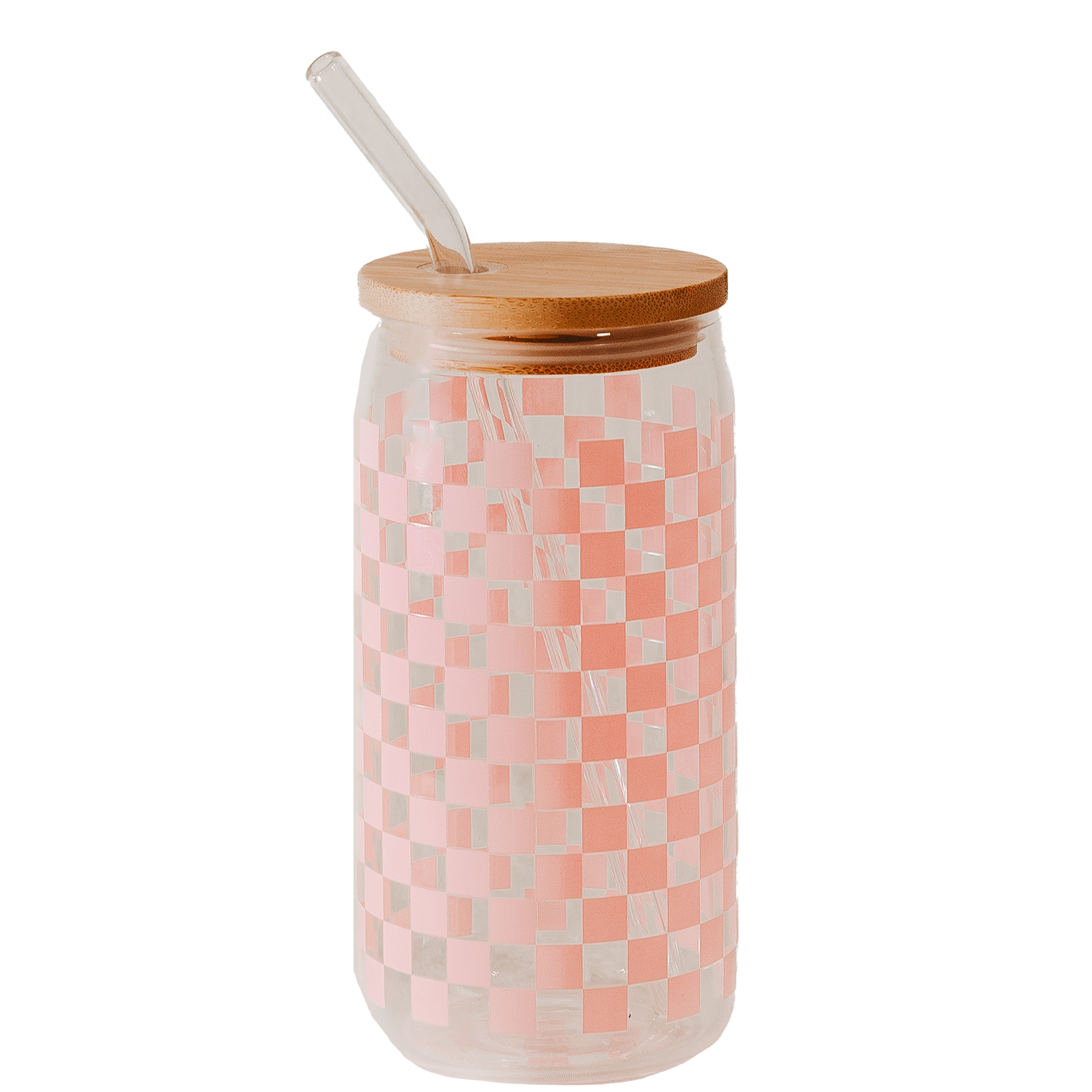 Elevate your sipping experience with the eye-catching checkered design of this glass can, perfect for your favorite drink. Accompanied with a glass straw and bamboo lid for added charm.