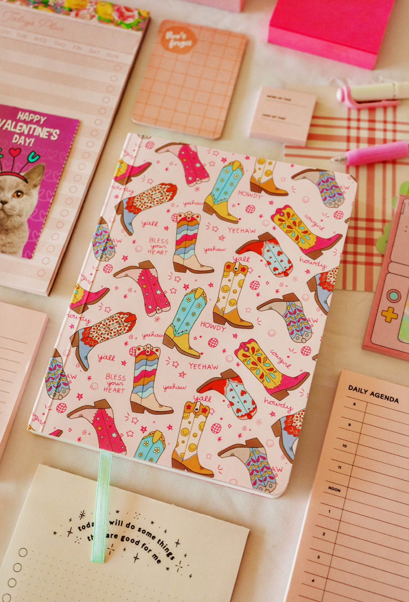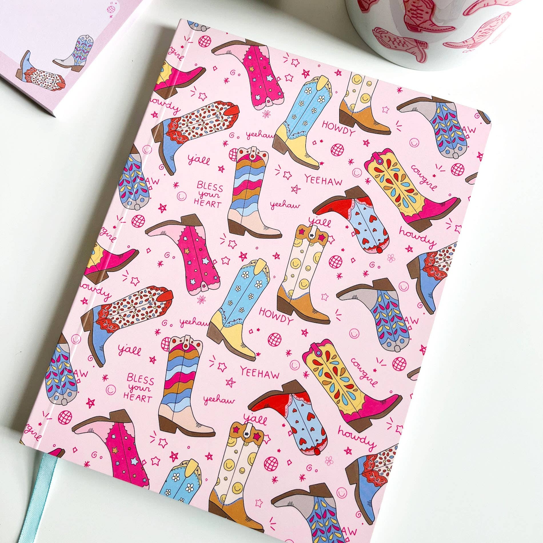 Capture thoughts, dreams, and adventures in our Cowgirl Boots Soft Flex Perfect Bound Journal. This beautifully crafted journal featuring hand-drawn cowgirl boots is not just a blank canvas but a thoughtful gift for the aspiring writer or dreamer. Inspire your favorite Texan, Western fan, teacher, student, or friend to document their journey in true Southern style.